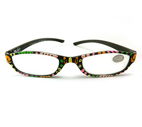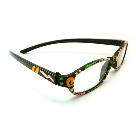 This individual hand painted, one of a kind black reader glasses are decorated with pink, green, orange, and yellow stripes, swirls and dot accents, giving them a more pulled together look those of us who want to make a subtle statement.