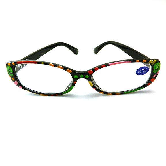 This individual hand painted, one of a kind black reader glasses are decorated with pink, green, orange, and yellow stripes, swirls and dot accents, giving them a more pulled together look those of us who want to make a subtle statement.