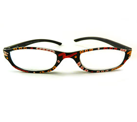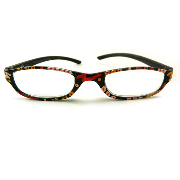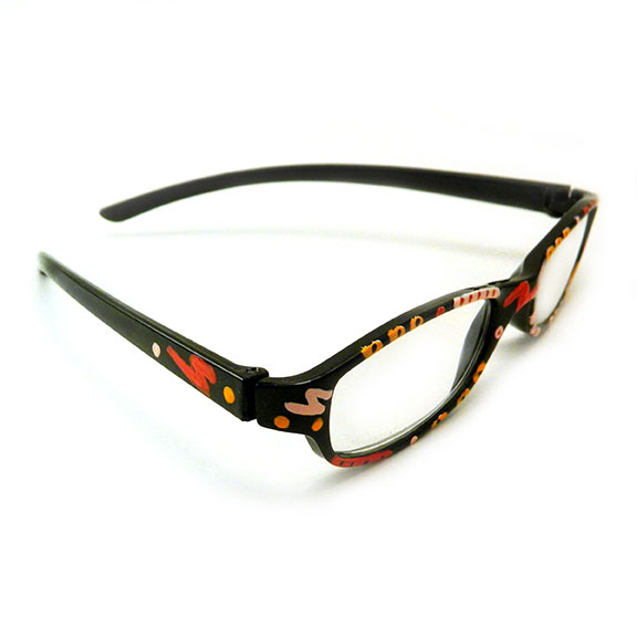 This individual hand painted, one of a kind black reader glasses are decorated with orange, red, peach, and yellow stripes, swirls and dot accents, giving them a more pulled together look those of us who want to make a subtle statement.