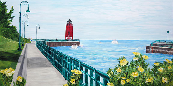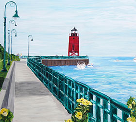 Charlevoix Lighthouse from Hoffman Park Large Print. This is the full version of the original 32’x60″ painting and is a signed print. The image area measures 8 3/4 inches high by 17 inches wide. It is a reproduction of “Charlevoix Lighthouse from Hoffman Park”, a commissioned table for the East Park Tavern restaurant in Downtown Charlevoix overlooking East Park.