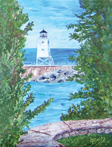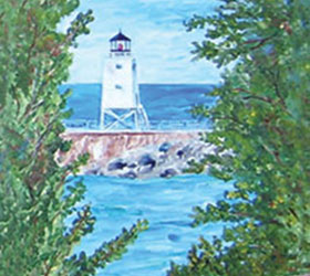 The Charlevoix Lighthouse “I” Like it White! Note Cards. This image is a reproduction of a painting I did of the iconic Charlevoix, Lighthouse on the Pine River Channel between Lake Michigan and Round Lake, connecting Lake Michigan to Lake Charlevoix… before they painted it red. It was white when I came to Charlevoix and to me, it will always be white. It was hard for me to accept when they painted it red. It didn’t fit into my “painter’s eye”. “What happened to my comfortable friend that had always been on the horizon and that I had painted from every angle for years?” The State of MI decommissioned the lighthouse and rather than tearing it down, they turned over the upkeep of the lighthouse to City of Charlevoix. When time came to do necessary maintenance, The Charlevoix Historical Society did the research, applied for grants, did fundraisers and restored the lighthouse to the red it was back in the 40’s or 50’s… before I came to town. It is an on going local discussion… the argument if you like it better red or if you like it better white was a hot topic at the local coffee shops. Of course it depends on when you grew up in Charlevoix or when you vacationed here or when Charlevoix holds a special memory for you that it makes a difference… or not. I still paint it white on occasion and title the painting: The Charlevoix Lighthouse “I” Like it White! Maybe I’m a rebel or wistfully remember my youth. Whichever way you like the lighthouse… Charlevoix is beautiful.