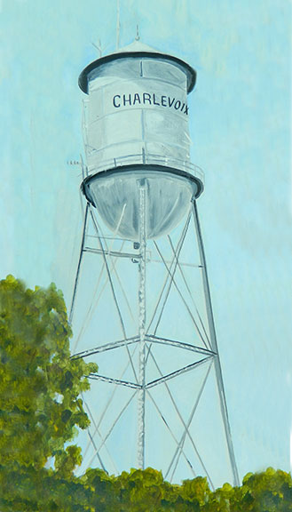 Charlevoix Water Tower Magnet. This 2 inches by 3.5 inch magnet has a reproduction of the original acrylic on metal painting of the old water tower in Charlevoix, Michigan.