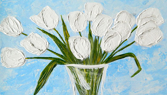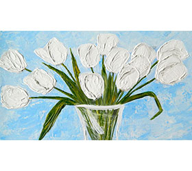 This magnet measures 2 inches by 3.5 inches. The image is a reproduction of “French Tulips”, a 9×12 acrylic on board. This Painting was in the juried show “In Blooming Color” presented by The Charlevoix Circle of Arts, juror Marge McGoff of the Charlevoix Garden Club.