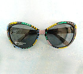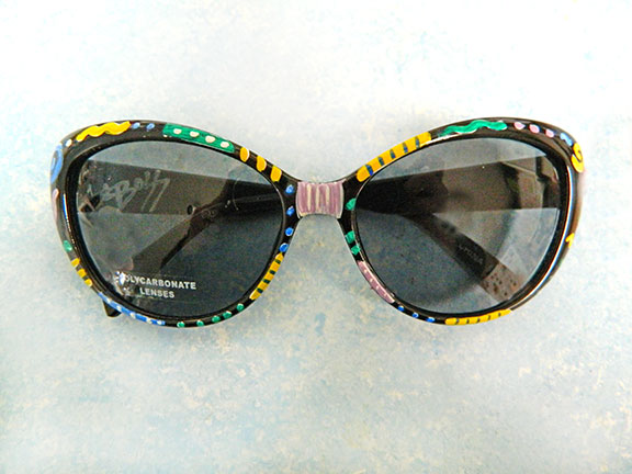 Hand Painted Sunglasses #3. These individually hand painted, one of a kind funky sunglasses will add zest to anyone’s summer. They are decorated with yellow, green, bright blue, white and lavender stripes, swirls and dots with black and white accents giving them a spunky feeling for those of us who want to make an excited statement. They are clear coated to give them a nice shine and to add durability. Signed by the artist. Polycarbonate Lenses. Ultraviolet Protection.