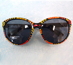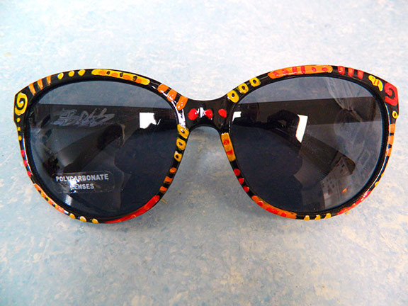 Hand Painted Sunglasses #5. These individually hand painted, one of a kind funky sunglasses will add punch to anyone’s summer. They are decorated with orange, yellow and red stripes, swirls and dots with red and black accents giving them a wild burst for those of us who want to make a fun statement. They are clear coated to give them a nice shine and to add durability. Signed by the artist. Polycarbonate lenses. Ultraviolet Protection.
