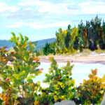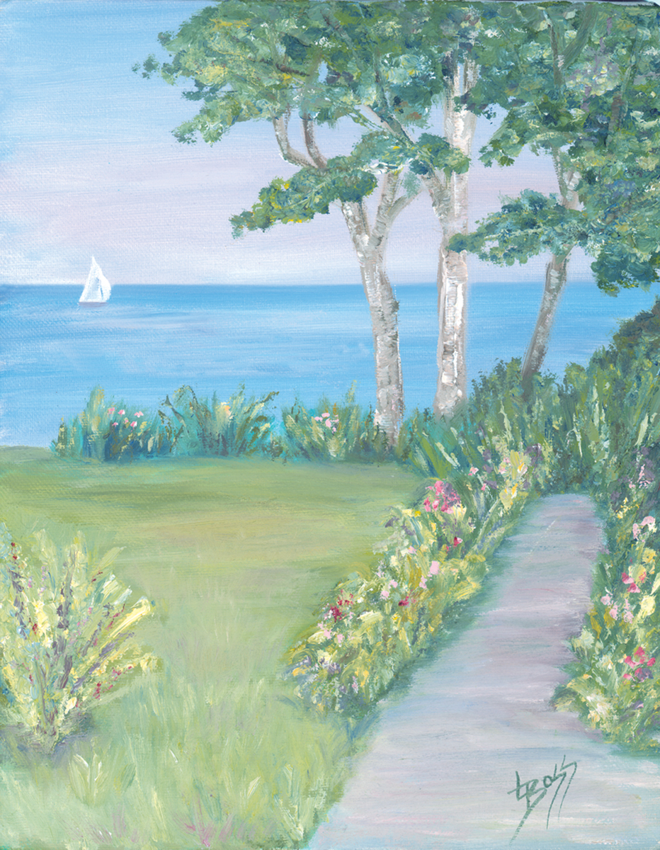 Lake Michigan Bluff. This print is available in three sizes 5×7, 8×10 & 11×14 and will fit in a standard frame. The image is from an original painting done in oil on canvas and captures the beauty of the view from one of the homes on Michigan Avenue in Charlevoix. I am lucky to have several friends who have homes on prestigious Michigan Avenue and a few clients too whom I also consider friends! They give me the opportunity to paint beautiful paintings like this. Sometimes if we are out on their porches visiting or having tea in the summer, I can’t help but scout around looking for interesting angles in which to paint. I usually have my camera with me to take reference shots or, if I’m REALLY lucky, they will let me set up and paint right there on the spot!