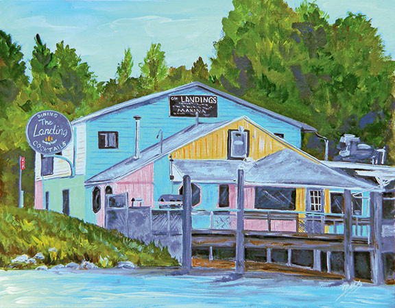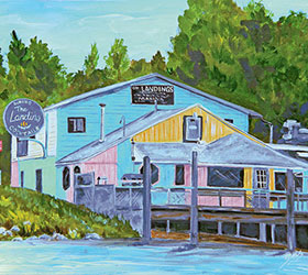 Landing Restaurant & Marina “Classic” Prints. This image is a reproduction of the original 11×14 acrylic on canvas board painting. This is the original building on the shores of Lake Charlevoix down by the Ironton Ferry. Sadly, it was in a bad state of repair and the docks were no longer safe so it was completely torn down the fall of 2014 and rebuilt in 2015. It is reopening in 2016 to a fabulous new building still with the same boaty feel but all new modern conveniences! I tried to capture the whimsical funkiness of the miss colored shabby chic fading boards and the misbegotten shape to save a bit of the visual history.