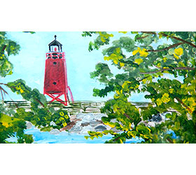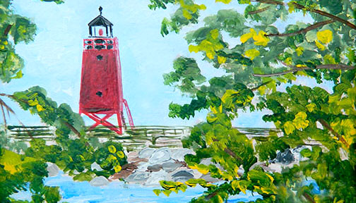 This magnet measures 2 inches by 3.5 inches. “Lighthouse Through the Trees”. The image is a reproduction of a painting of the Charlevoix Lighthouse as seen through the trees just as the sun is getting ready to set from a viewing deck on the sand dunes of Michigan Beach, one of the City’s three public beaches. The original painting was a small 5×7 piece and was a quick sketch I did as a study for a possible larger painting and has a loose, light and airy feeling. I am always looking for new and interesting views and angles of the lighthouse. It is one of my favorite subjects to paint. I never get tired of trying to bring new adventures to an old subject. Michigan Beach is the most popular place in Charlevoix in the summer to watch the sunset. The beach is crowded, the cars are parked full circle and boats are scattered out from the pier opening spawning out in a large semi circle – bobbing in anticipation of one the beautiful west coast Northern Michigan sunsets. Sometimes people clap in appreciation as the fiery red ball sinks below the horizon line, car horns honk and boats air horns blast a salute to the end of a perfect summer evening.