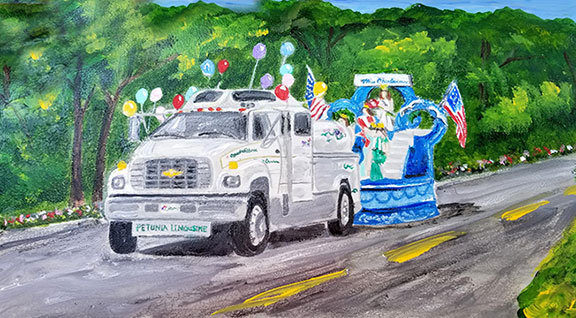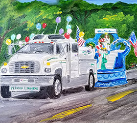 Operation Petunia started in 1982 at the kitchen table of my in-law’s house, Dale and Marilyn Boss. They have always loved flowers and loved Charlevoix, plus Dale was a real go-getter. (See Petunia Story). Each year Charlevoix planted 60,000 petunias for five miles. It was a sea of color on both sides of the street on both sides of town… north of the Bridge and south of the Bridge. The Petunia truck or Petunia Limousine as Dale referred to it, was used to water the flowers. Marilyn used to call it “his mistress” because he spent so much time with it… watering the flowers and polishing it! They watered all the petunias all summer long with Dale at the helm, getting up at 4 am every morning, donating his time. For years it pulled the float in the Venetian Parade carrying the Venetian Queen and her court on their first official task and then throughout the following summer to all the parades in the north. Marilyn painted it up with flowers and it played music and had a bubble blower for parade viewers.
