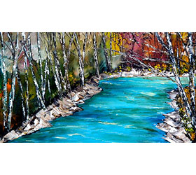 This magnet measures 2 inches by 3.5 inches. The image is a reproduction of “The Jordan River”, a 16×20 oil painting I did with only a palette knife, of a sharp bend in the Jordan River that runs near East Jordan, Michigan. I really love the depth of color oils have over acrylics. I also like the blending capabilities and of course, the “chunkiness” of the paint effects you can get… much better than with the acrylics. I did this in honor of my nephew and niece for their wedding. They love the outdoors… plus his name is “Jordan”! But… there is a “story” behind this painting… an inspiration. The Jordan River also has a fond place in my memories, especially this spot I chose to paint. My aunt and uncle came up from Ohio for a visit and we wanted to do an activity to “entertain” them… you know… show the guests from out of town a good time. We took them canoeing. They said they had done it before but it had been years. I hadn’t done it since I was a kid in camp and I don’t think my husband had ever done it so I figured we all were evenly skilled. What a riot! We had a blast! I was impressed that Jim and I caught on pretty quickly and were in sinc. My aunt and uncle (who are actually only 6-8 years older than I am respectively) had a little rougher time. They ended up sideways and backwards at this “bend” in the river. Oh the words that were flying! We did make it to the end, the pick up point all in one piece. We all laughed so hard “at” the whole thing… quite an adventure!