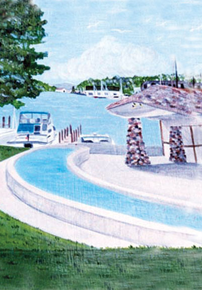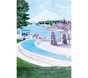 The trout pond was originally in East park on the south side. When the renovated the park in 2009, they created a trout “stream” and made it look all “natural” which is cool and everything but the old trout pond was like a swimming pool for fish. The kids could come up and see the fish clearly… and up close. Probably scarier for the fish too. The Odmark Pavilion (which is now rebuilt and referred to as an amphitheater) was built in the style of the Earl Young “Mushroom Houses”… it fit Charlevoix. Yes, the new one is acoustically better and seats more and has better lights… but it doesn’t have “character”. This painting is a study for a scene I did on “Charle-fish” for the Great Northern Fish-In sponsored by the North West Michigan Red Cross as a fundraiser. It is acrylic on fiberglass.