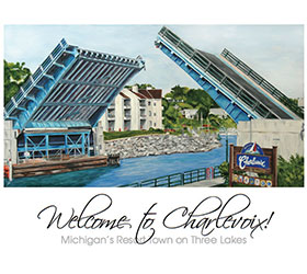 Welcome to Charlevoix. This image is a reproduction of “Welcome to Charlevoix!”, a commissioned table for the East Park Tavern restaurant in Downtown Charlevoix overlooking East Park. I did a series of Charlevoix themed paintings for their Topside deck with a marketing idea “Where you can Dine on Fine Art and Enjoy the View”. I had wanted to do this for years, a Charlevoix themed restaurant featuring my paintings and had even approached a couple of them to do this but no one did until “The East Park Tavern”. Now, everyone loves the idea! I hope it brings them LOTS of business since they took a chance and saw my “vision”.