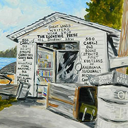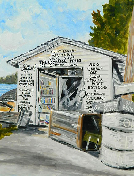 Dockside Press of Charlevoix Note Card by Linda Boss. Reproduction of the painting of the Dockside Press of Charlevoix in the 70’s and early 80’s located on Belvedere Avenue overlooking Round Lake.