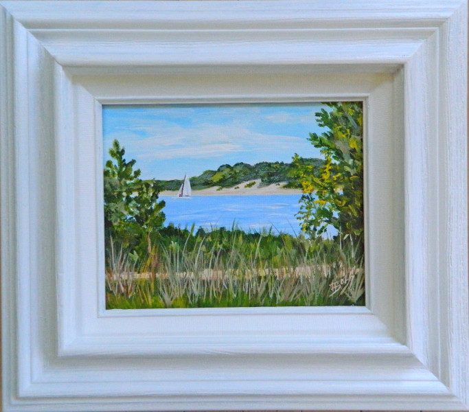 The Dunes at Mt McSauba Original Painting by Linda Boss is an original plein air painting painted on Lower Shore Drive out by the Charlevoix Hospital. There is a nice view across the bend in the lake of the back side of Mt McSauba, the back hill and the dunes and the beach below. It was painted during a group outing with the Northern Michigan Plein Air Painters. It was an early summer day and I painted it before the sun got too high in the sky. There was a nice breeze coming off the lake. That is the nice thing about Lake Michigan. It rarely gets “too hot” to paint if you are anywhere near it!