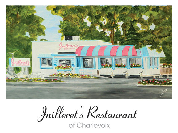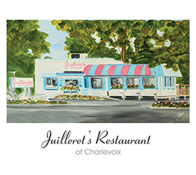 Juilleret’s Restaurant of Charlevoix – Note Card by Linda Boss. Juilleret’s was a longtime favorite restaurant in Charlevoix that served wonderful breakfasts and the most unbelievable cinnamon toast you had ever had. You could buy a loaf of it and take it with you. That era is now gone. The restaurant is closed. The owner retired. The building sold and torn down. Something new and modern will go up in its place. Time moves on I guess and some may say it was time for the building to be replaced. But to an artist’s eye, this beautiful, colorful character of a building holds many fond memories. I will miss it.