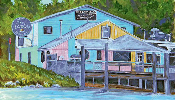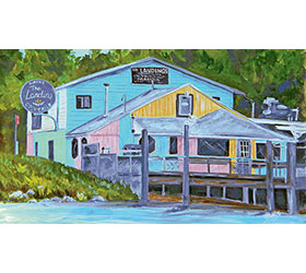 The Landings Restaurant & Marina “Classic” – Magnet. This magnet measures 2 inches by 3.5 inches. This image is a reproduction of the original 11×14 acrylic on canvas board painting. This is the original building on the shores of Lake Charlevoix down by the Ironton Ferry. Sadly, it was in a bad state of repair and the docks were no longer safe so it was completely torn down the fall of 2014 and rebuilt in 2015. It is reopening in 2016 to a fabulous new building still with the same boaty feel but all new modern conveniences! I tried to capture the whimsical funkiness of the miss colored shabby chic fading boards and the misbegotten shape to save a bit of the visual history.