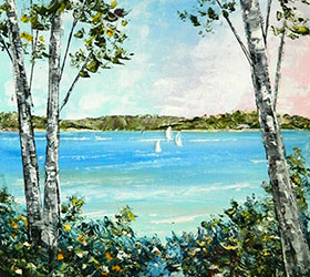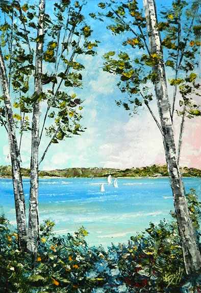 Summer Up North – Note Card by Linda Boss. This print is a reproduction of the original 12×16 oil painting I did with only a palette knife. It is a scene of the perfect view of the summer in Northern Michigan!