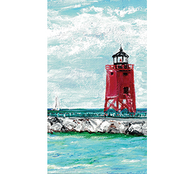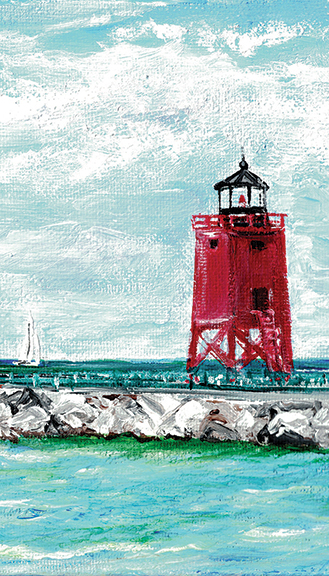 This is a favorite view of the lighthouse. I enjoy painting it because it never turns out the same. The light is always different, the paint takes to the canvas or whatever I am painting on differently and that always affects the overall look of the painting. This one has a decidedly textured look that I like. I sat on the beach close to the rocks to get the perfect angle. This has a fresh summer afternoon feel. I invite you to come and see us in person! Charlevoix the Beautiful, the resort city on three lakes.
