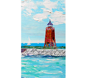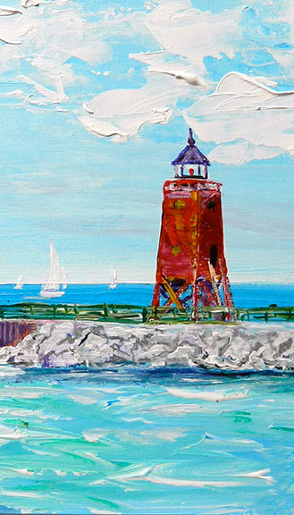 A Sunny Day in Charlevoix – Magnet by Linda Boss. This magnet measures 2 inches by 3.5 inches. This image is a reproduction of the original 10×10 acrylic on board studio painting. It was done with a brush and a palette knife so there is a nice texture. I often work from photos and used to carry my camera with me in the car to take reference pictures when I could. Now it is much easier with my phone. This was a bright sunny day and I loved the color of the sky and water framed the lighthouse. I was very happy painting this painting on an early spring day in anticipation of the summer to come. I think it shows… it is a “happy” painting wouldn’t you say? I love the way the chunky clouds turned out and the bright blues of the sky and the water. The original was very cottagey with a white washed chunky wood frame. It was inspired by the way the sun was bouncing off the side of the lighthouse and casting interesting shadows on the rocks on the south pier. I also thought the way the waves were rolling in to shore and the blues and greens of the water were bright and cheery. I needed that after the long, cold, gray Northern Michigan winter.