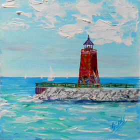 A Sunny Day in Charlevoix Note Card by Linda Boss. This image is a reproduction of the original 10×10 acrylic on board studio painting. It was done with a brush and a palette knife so there is a nice texture. I often work from photos and used to carry my camera with me in the car to take reference pictures when I could. Now it is much easier with my phone. This was a bright sunny day and I loved the color of the sky and water framed the lighthouse. I was very happy painting this painting on an early spring day in anticipation of the summer to come. I think it shows… it is a “happy” painting wouldn’t you say?