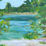 This magnet measures 2 inches by 3.5 inches. The image is a reproduction of “The Jordan River”, a 16×20 oil painting I did with only a palette knife, of a sharp bend in the Jordan River that runs near East Jordan, Michigan. I really love the depth of color oils have over acrylics. I also like the blending capabilities and of course, the “chunkiness” of the paint effects you can get… much better than with the acrylics. I did this in honor of my nephew and niece for their wedding. They love the outdoors… plus his name is “Jordan”! But… there is a “story” behind this painting… an inspiration. The Jordan River also has a fond place in my memories, especially this spot I chose to paint. My aunt and uncle came up from Ohio for a visit and we wanted to do an activity to “entertain” them… you know… show the guests from out of town a good time. We took them canoeing. They said they had done it before but it had been years. I hadn’t done it since I was a kid in camp and I don’t think my husband had ever done it so I figured we all were evenly skilled. What a riot! We had a blast! I was impressed that Jim and I caught on pretty quickly and were in sinc. My aunt and uncle (who are actually only 6-8 years older than I am respectively) had a little rougher time. They ended up sideways and backwards at this “bend” in the river. Oh the words that were flying! We did make it to the end, the pick up point all in one piece. We all laughed so hard “at” the whole thing… quite an adventure!