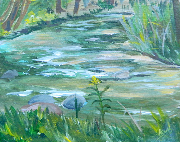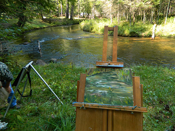 ” The River’s Bend – original painting by Linda Boss ” is an original plein air painting painted in Grand Traverse County at a bend in a branch of the Boardman River. My friend Margie and I go trekking in her big four wheel drive Ford pick up looking for interesting places paint. It was hot this day and it was a second painting for us. This one was especially satisfying because I was able to match the colors so well. I took a pic of the painting on the easel and it blended right into the background. I find acrylics harder to get true natural colors than oils, especially out in the field. Margie is really opening my eyes to the world of plein air painting. She is a blast to hang out with and shares her experiences and gives me tips. It is fun to bounce ideas off of each other. She has watched me fight and curse and wrestle with acrylics drying out in the field and she is encouraging me to switch to oil. I have used oil in the studio… I’ve just been comfortable in what I’m used to… I just need the push… hell, I’m going to do it!