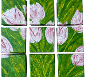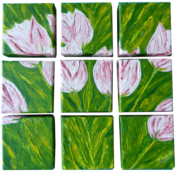 This original painting was created special for a show at the Jordan River Arts Council (JRAC) called “Squared and Squared” again. You had to create two things that had to do with a square and present together. I chose my favorite subject “the pink tulip” and painted it on a “square” canvas and to make it “special”, to stand out in the show, make it into a larger “square” using “square components”. This tulip “puzzle”, when put together and hanging on the wall, creates a three dimensional piece that casts shadows adding to the overall depth of the piece. The paint forming the tulips, wraps down and around all sides of the canvases adding another way for this piece to be viewed. You can walk from one side of it to the other and the cast shadows change, giving it a life of its own. It is truely a unique and inspirational conversation piece. It was also shown in the Charlevoix Circle of Arts (CCA) juried show “In Blooming Color”.