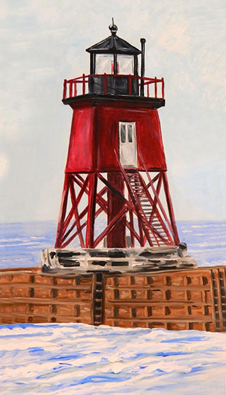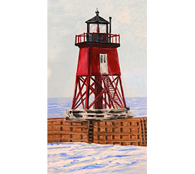 Wooden Charlevoix Lighthouse Magnet. This 2 inches by 3.5 inch magnet has a reproduction of the original acrylic on metal painting of the old wooden lighthouse on the South Pier in Charlevoix, Michigan.
